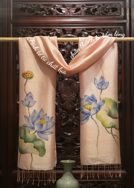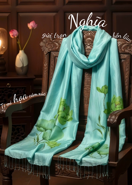 Mỗi chiếc khăn choàng lụa được làm bằng sợi tơ tằm tự nhiên cao cấp, là sản phẩm tinh túy được kết tinh từ nghề thủ công truyền thống của Việt Nam. Chất liệu tơ tằm tự nhiên mềm mại, bền đẹp và còn chứa đựng cả giá trị văn hóa và tâm huyết của người thợ dệt.