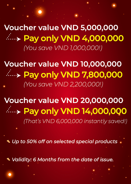 Hạn sử dụng đến 6 tháng (kể từ ngày nhận Code Voucher). Đây là lựa chọn lý tưởng cho dịp Noel – Tết Dương Lịch – Tết Nguyên Đán. Nhiều mệnh giá linh hoạt giúp bạn dễ chọn lựa.