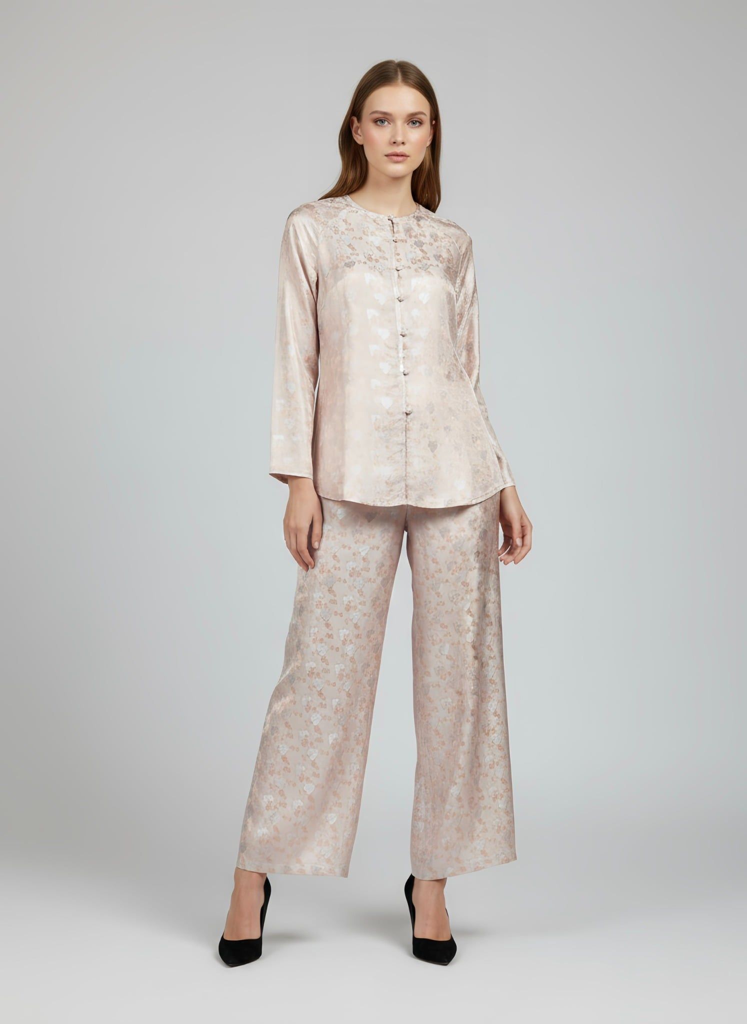 Chất liệu thượng hạng: Được dệt từ những sợi lụa tự nhiên cao cấp, bộ bà ba mang đến cảm giác mềm mại, mướt mịn trên da và độ bóng nhẹ sang trọng, tôn lên khí chất của người mặc.