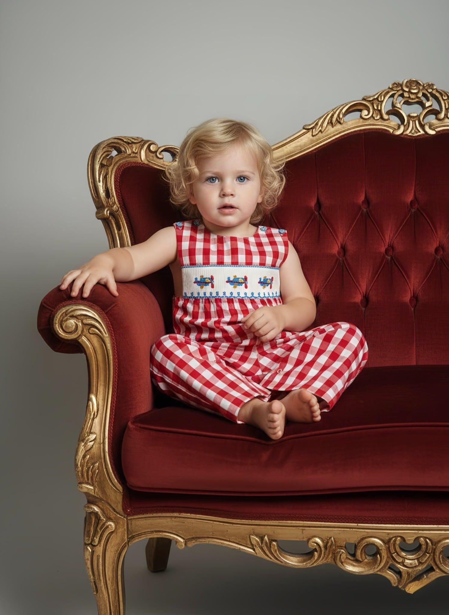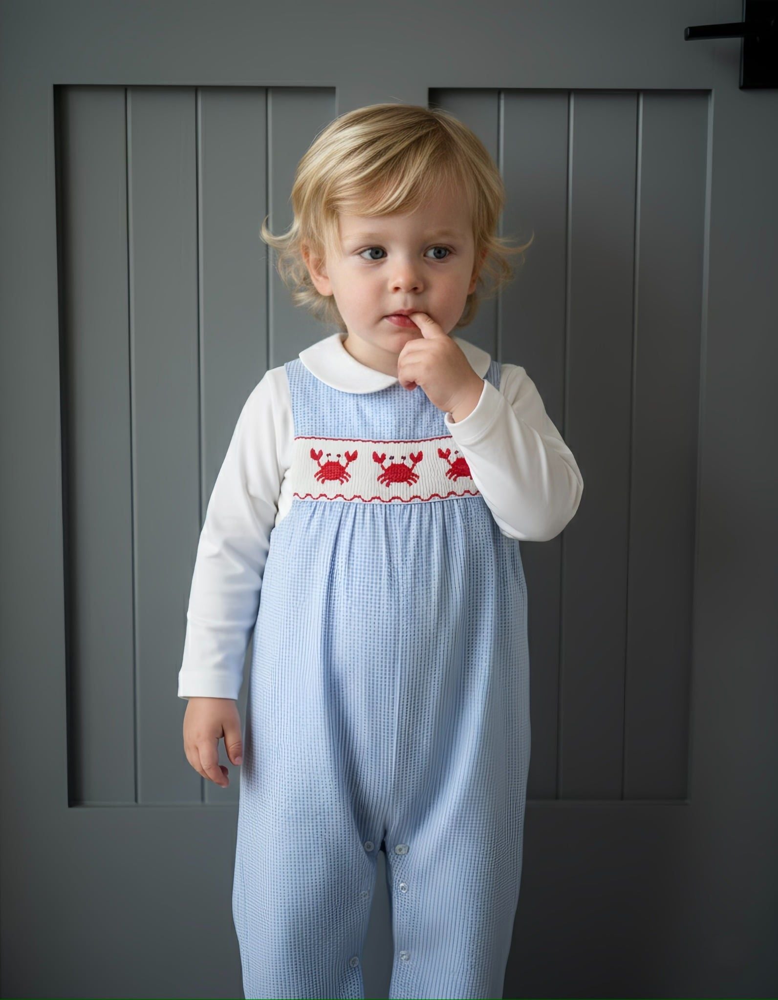 Thiết kế: Lấy cảm hứng từ thời trang hoàng gia Anh Quốc, bộ smock bé trai mang đến vẻ ngoài chỉn chu, thanh lịch với phần cổ sen và phom dáng áo quây/liền quần cổ điển.