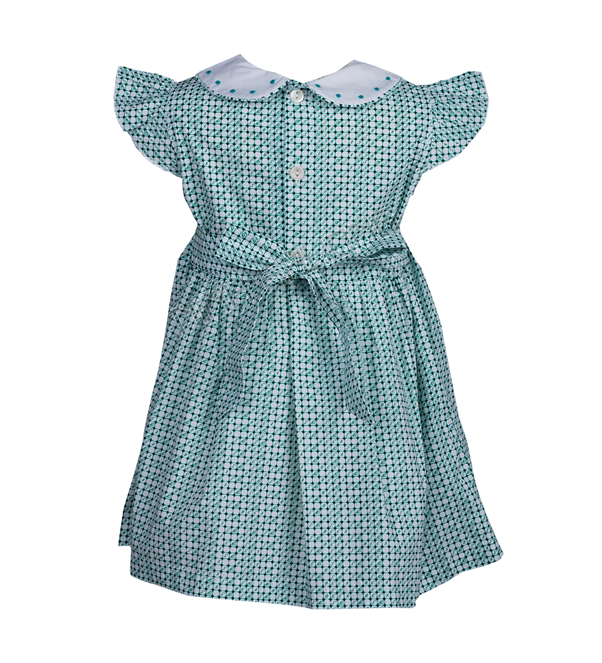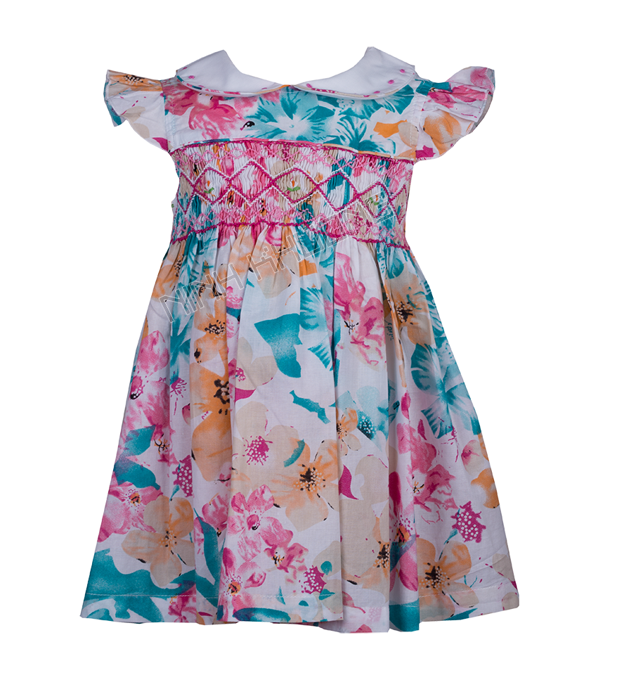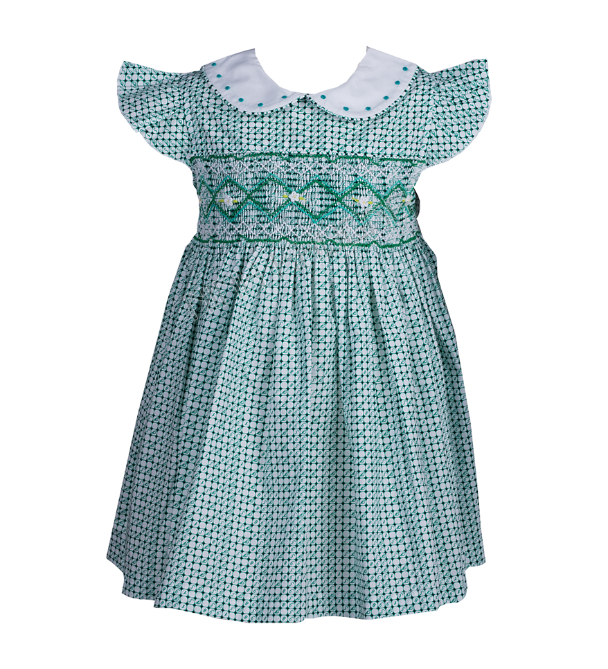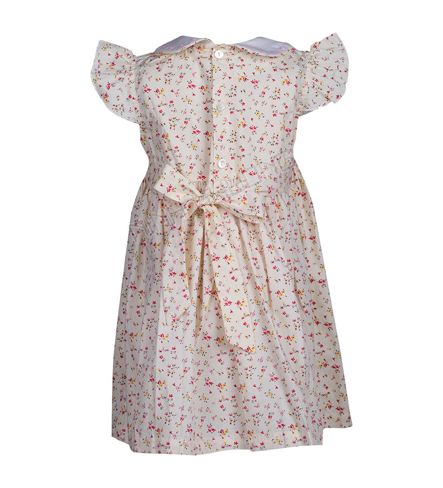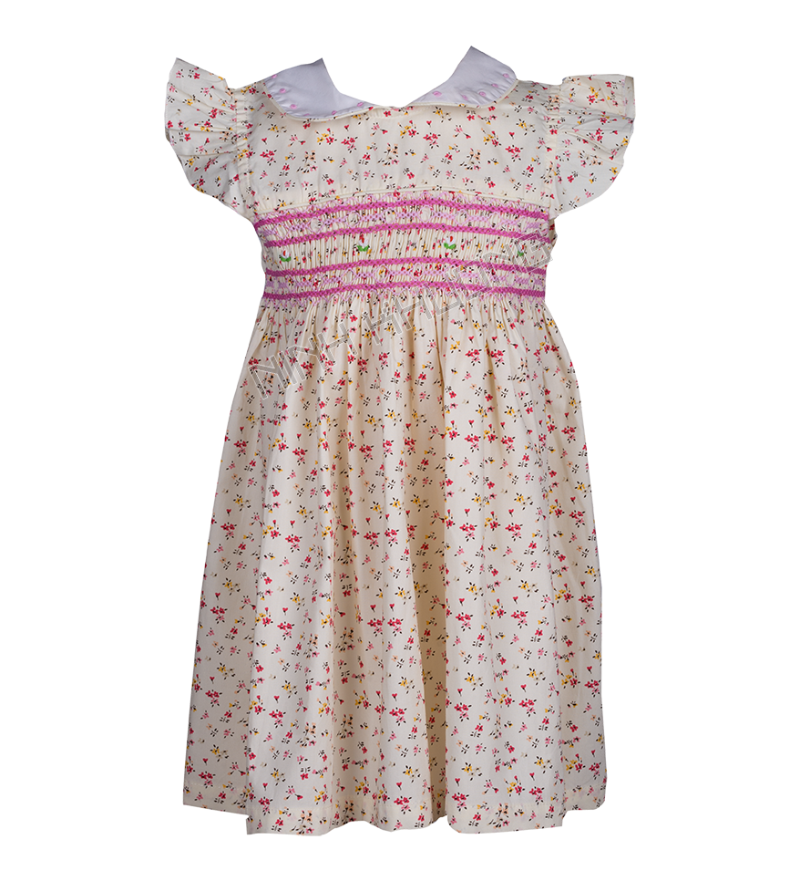 - White smocked dress with a Peter Pan collar and flutter sleeves