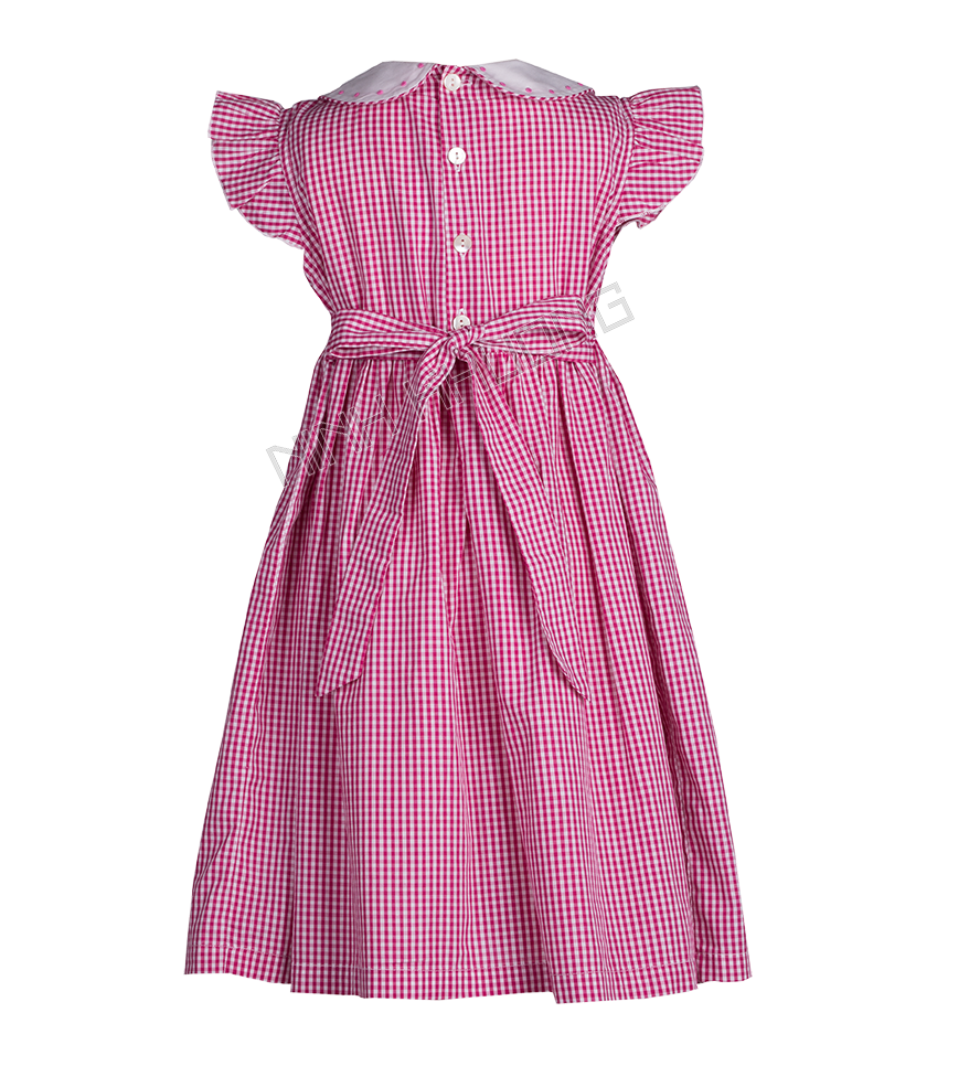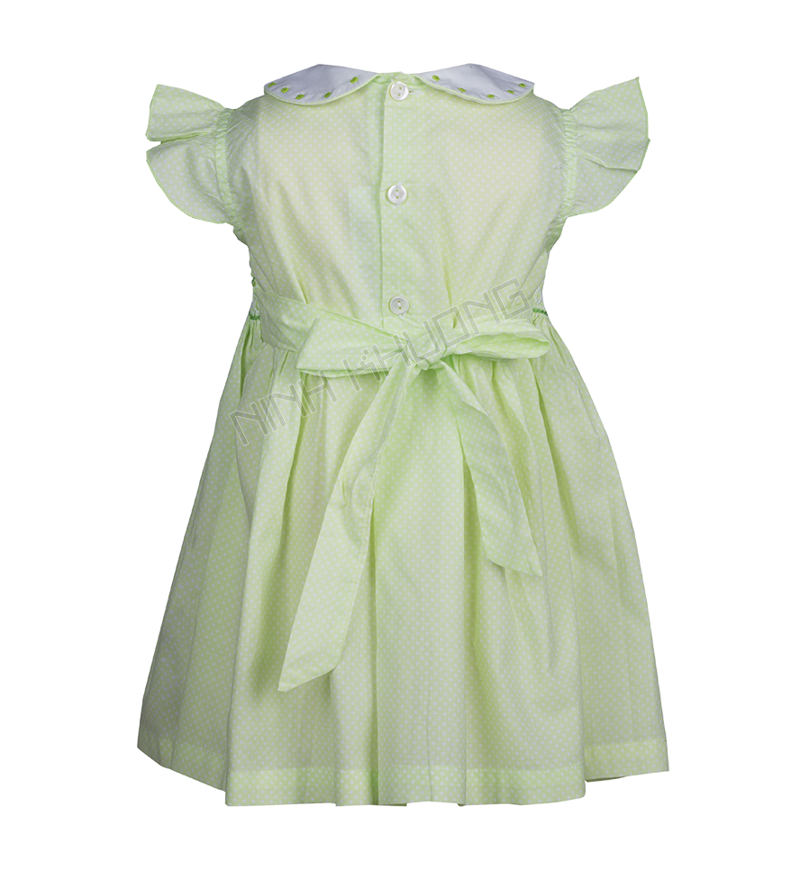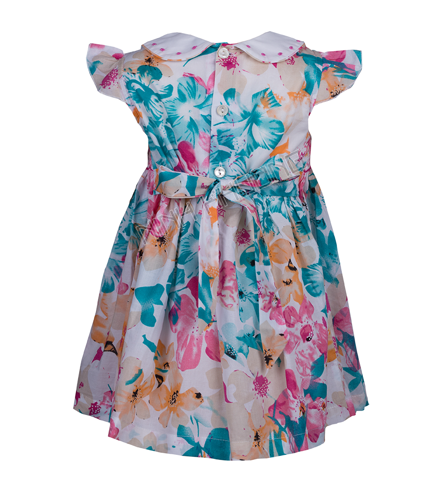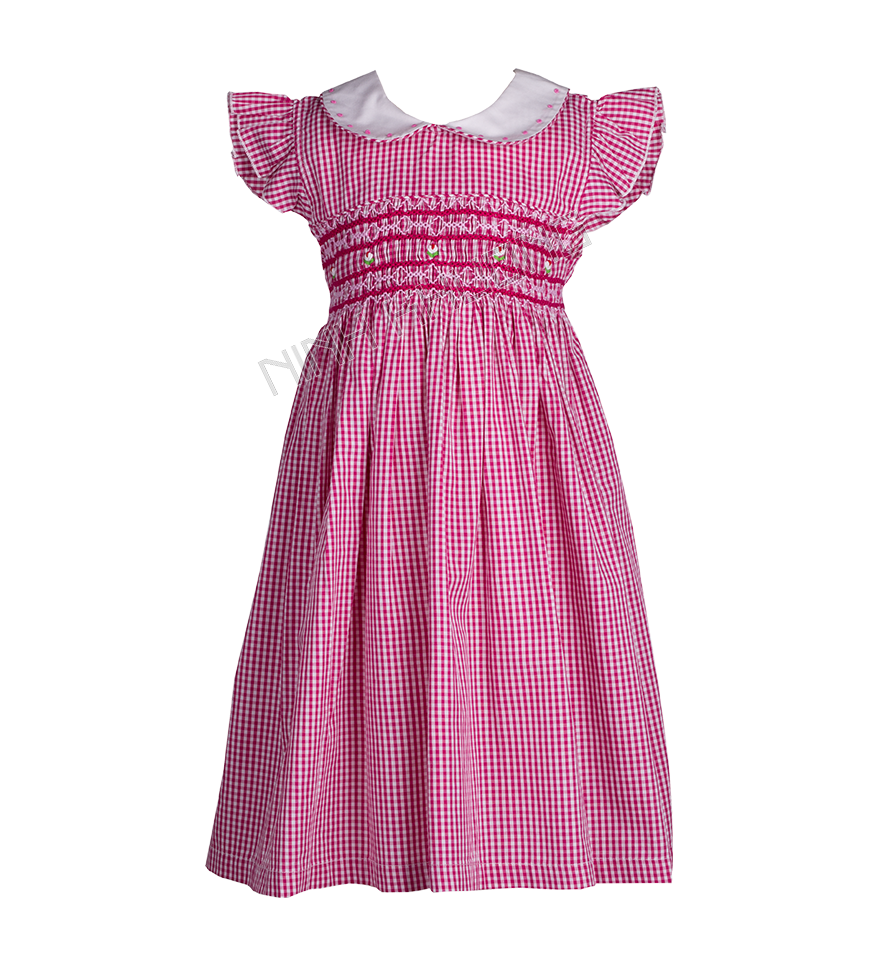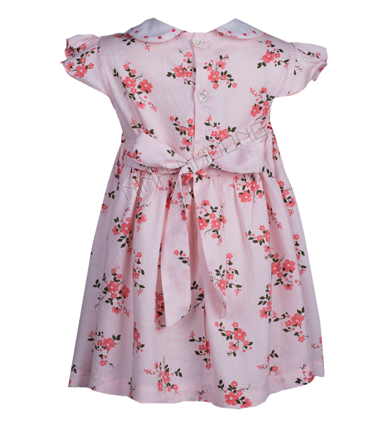 - White smocked dress with a Peter Pan collar and flutter sleeves