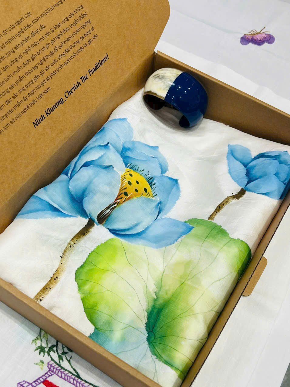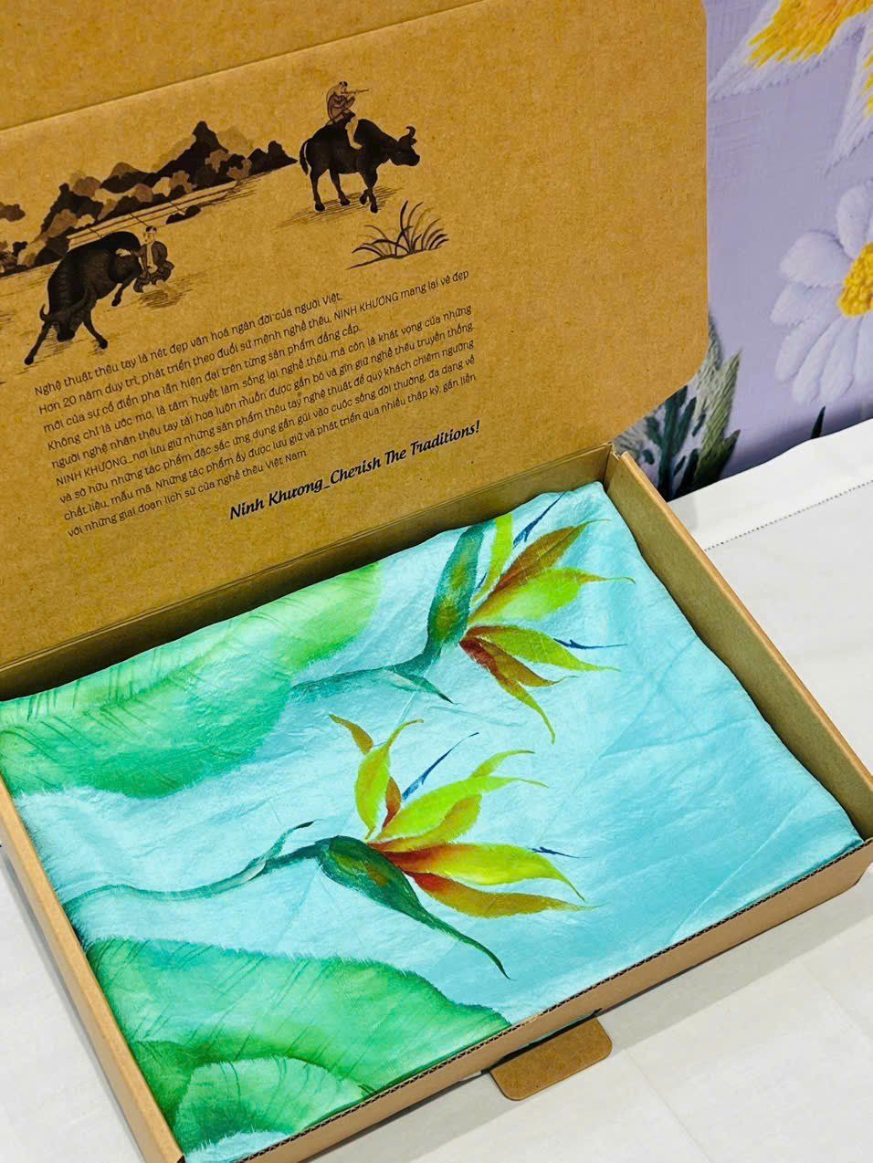 Mỗi chiếc khăn lụa tơ tằm nguyên bản đều được nâng niu như một "Bảo Vật", kết tinh những gì tinh túy nhất từ thiên nhiên. Nghệ nhân Ninh Khương đã thảo nét họa Hoa độc bản trên hất liệu Lụa mềm mại, óng ánh, đây không chỉ là phụ kiện mà còn là tuyên ngôn về phong cách, thể hiện sự tinh tế và đẳng cấp của người sở hữu.