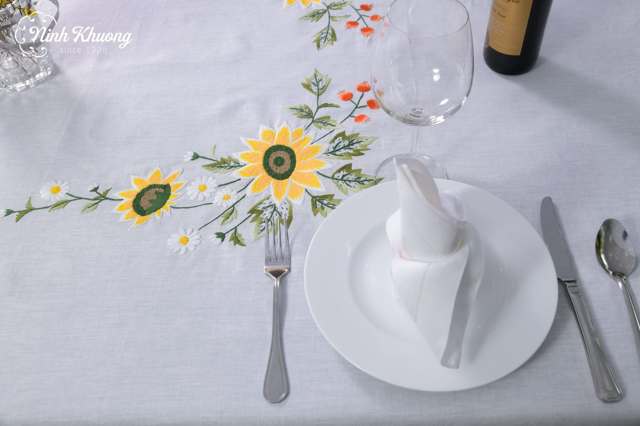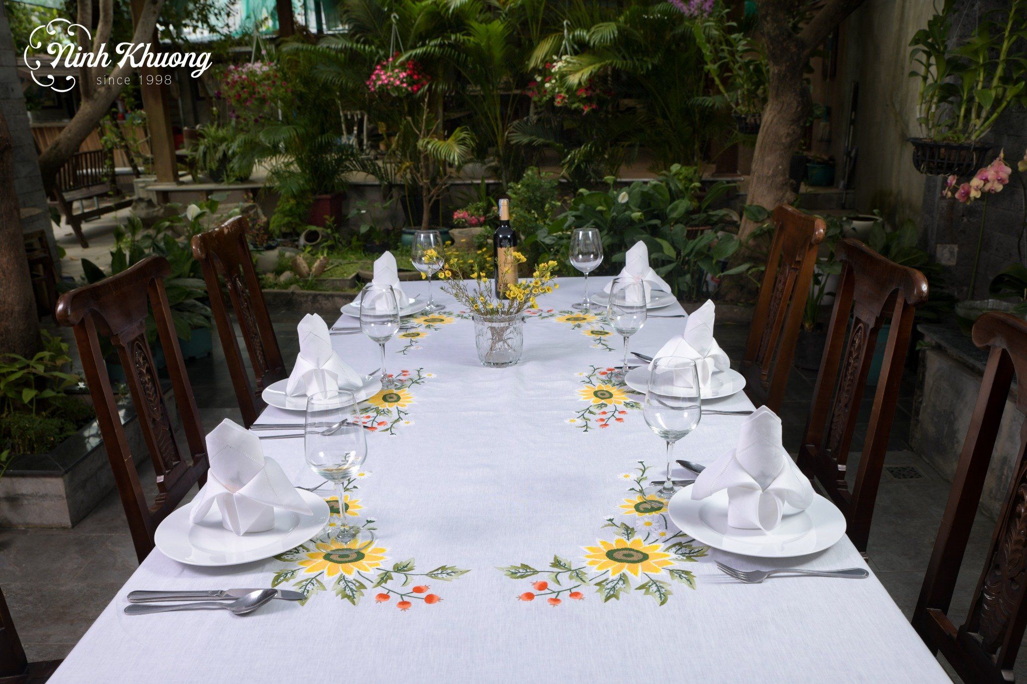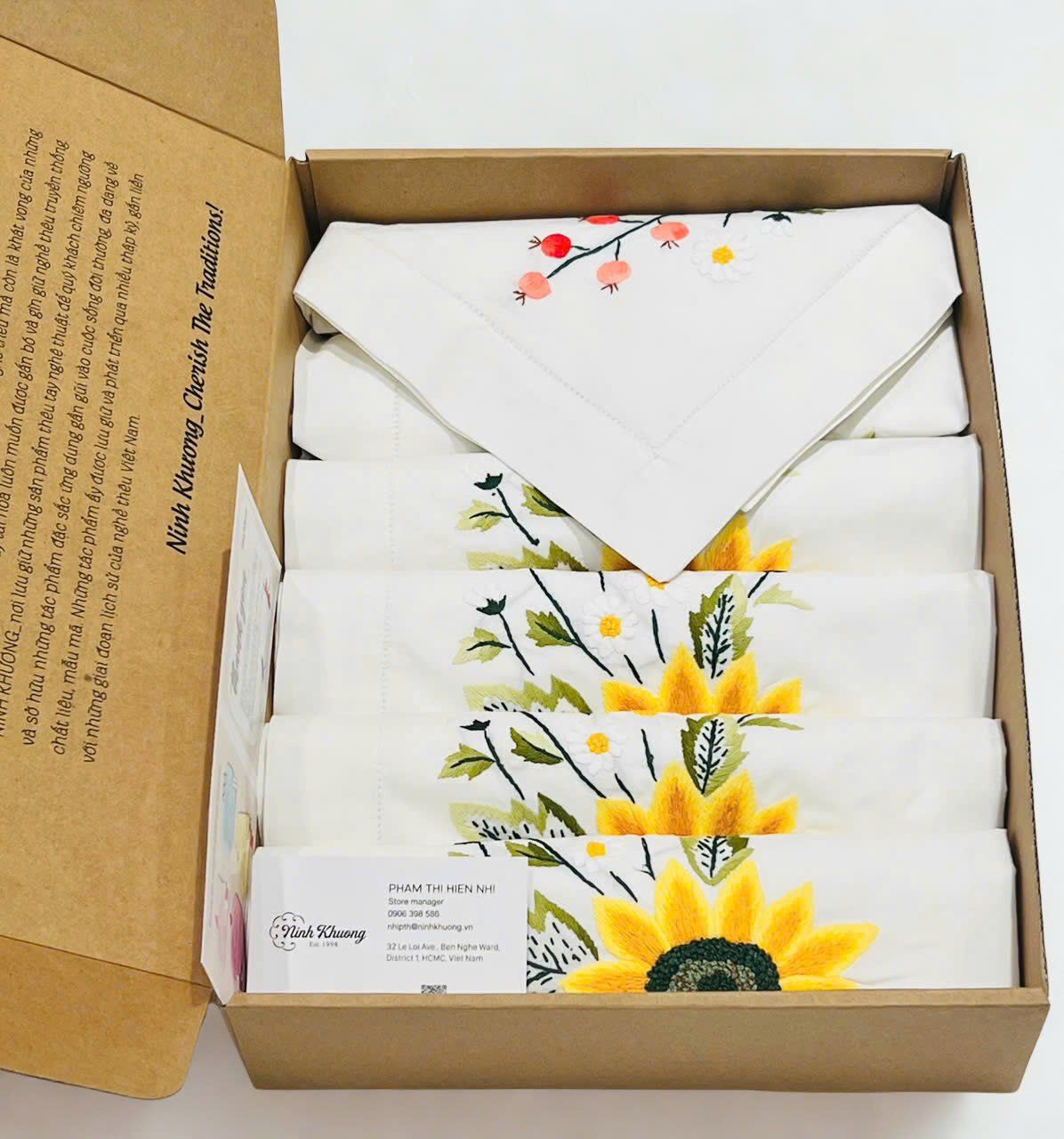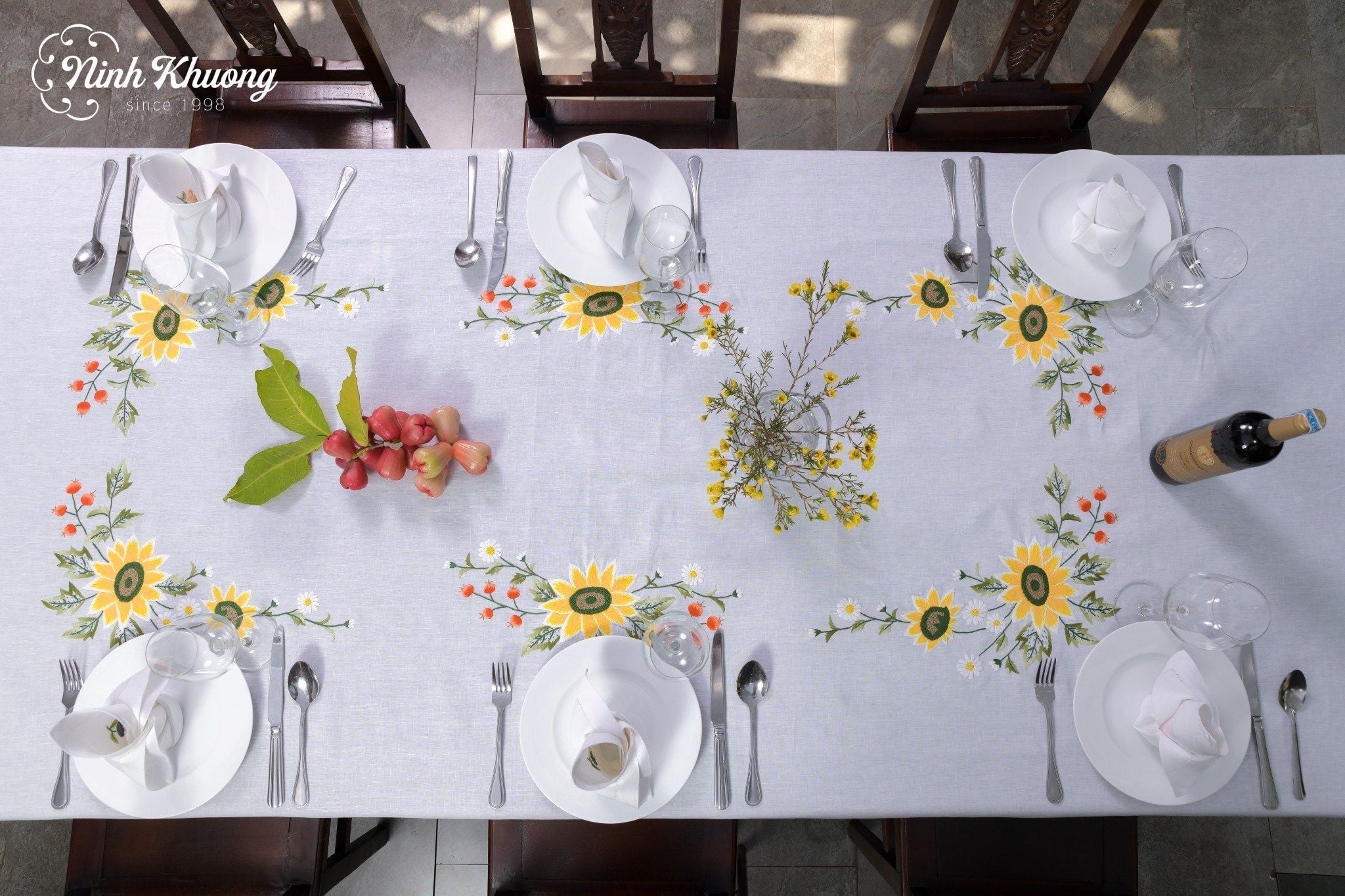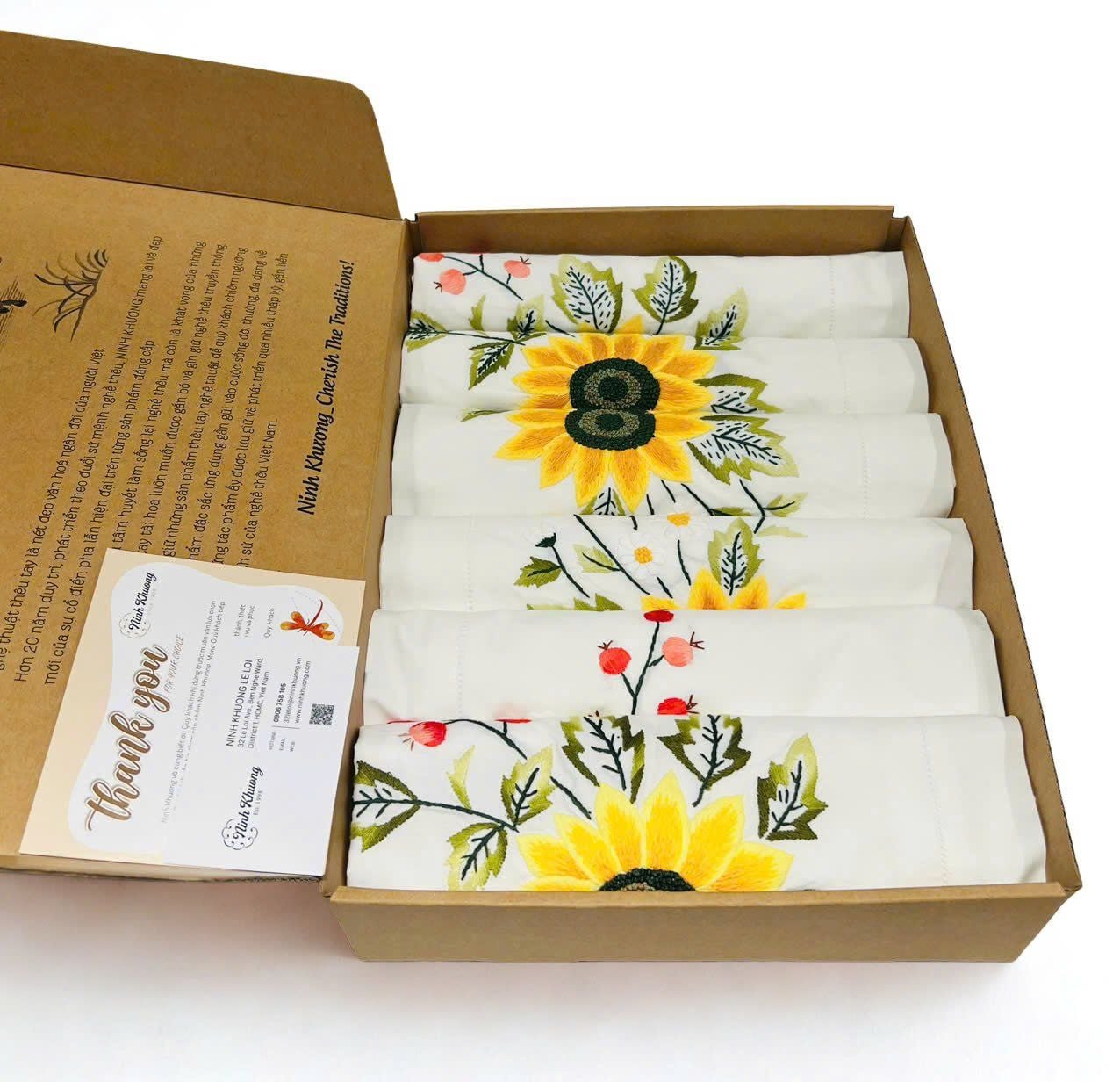 - 01 khăn bàn + 08 khăn ăn https://ninhkhuong.com/products/table-cloth-khan-ban-8k175x250-hoa-huong-duong-trai-do