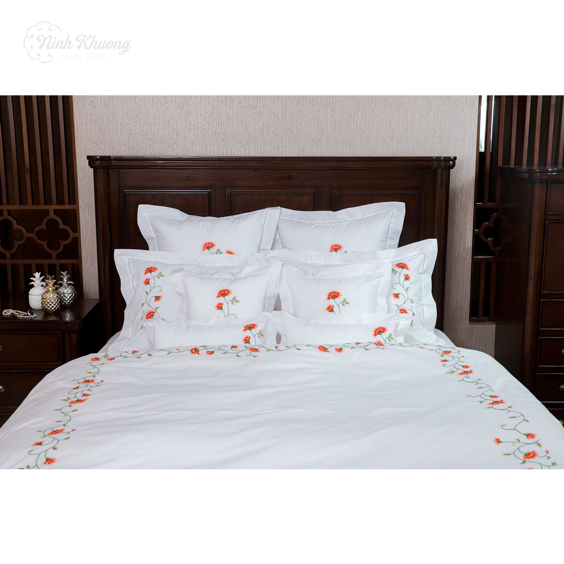 Double bed bedding set - French Horn Flower (duvet cover 220x240, fitted sheet 270x320, pillows 50x70, 60x60, 45x45, 25x50/pair) - wrapped in CIP fabric